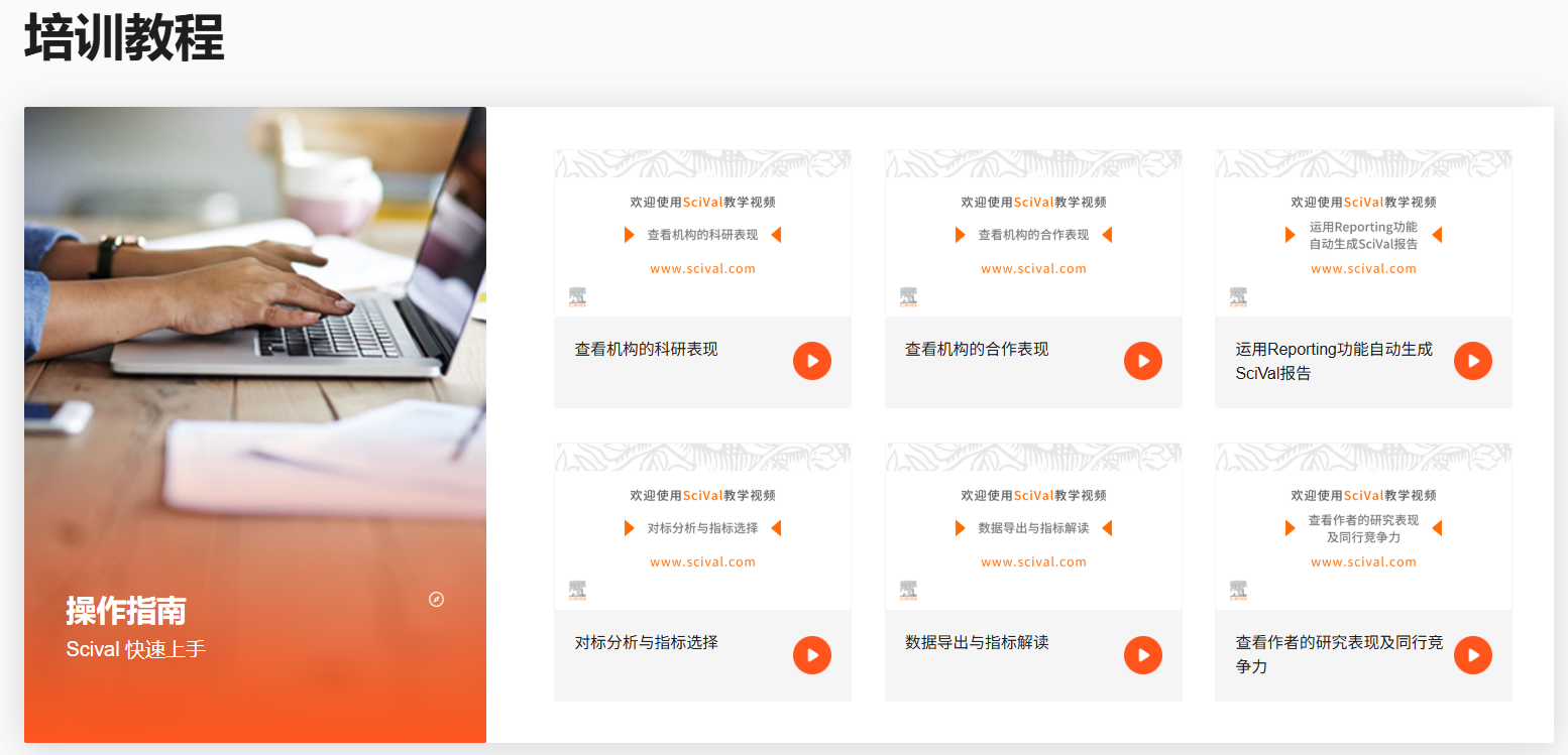 SciVal一站式学习平台: SciVal - 思唯学苑 - 科研站 ,汇集介绍、使用指南、以及全国线上培训的直播和视频回放等内容。各位读者可随时获取所需信息。其中,“培训教程” 模块的内容是每个5-7分钟的小视频,方便快速上手学习。