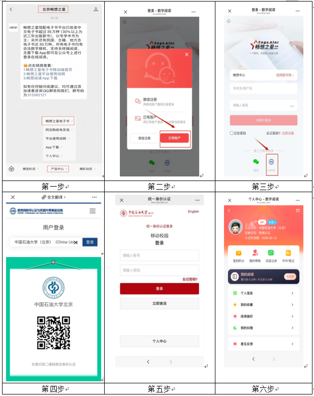 微信端:关注“北京畅想之星”微信公众号→产品中心→畅想之星电子书→已有账户→选择“carsi”→搜索“中国石油大学(北京)”→长按前往身份认证→统一身份认证登录,个人中心中“认证机构”显示“中国石油大学(北京)”即为认证成功。
