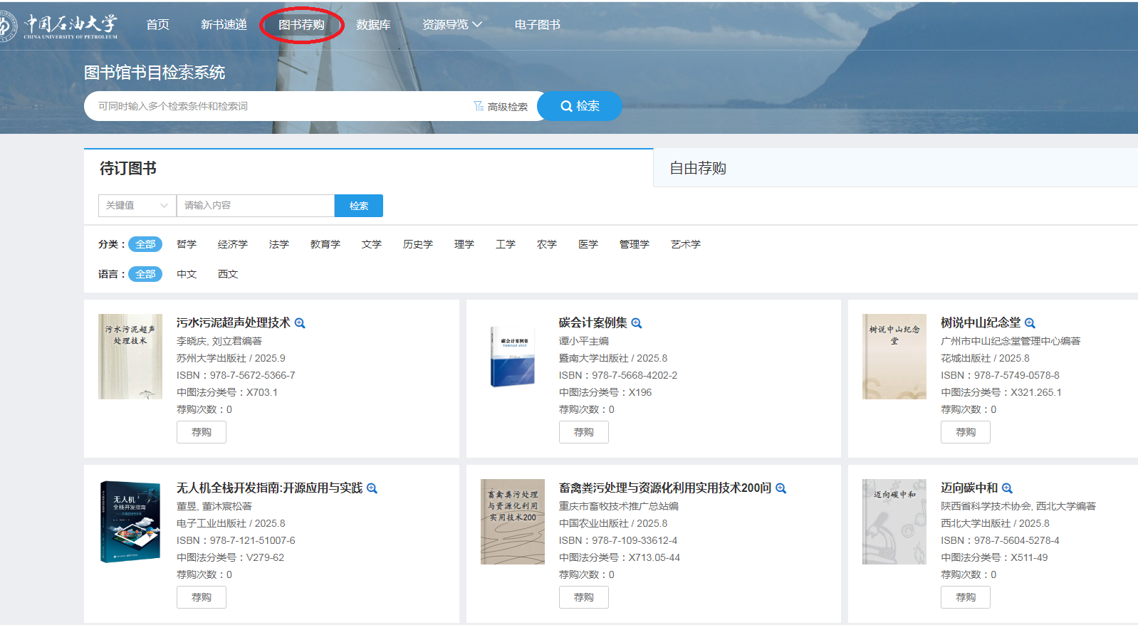 进入我校图书馆网站https://library.cup.edu.cn/,点击网页左上角馆藏目录-->中国石油大学图书馆书目检索系统,首先点击右上角“账号登录”进行登录,登录后点击最上方“图书荐购”进行荐购。读者可以通过“待订图书”或“自由荐购”向图书馆推荐所需中外文图书。