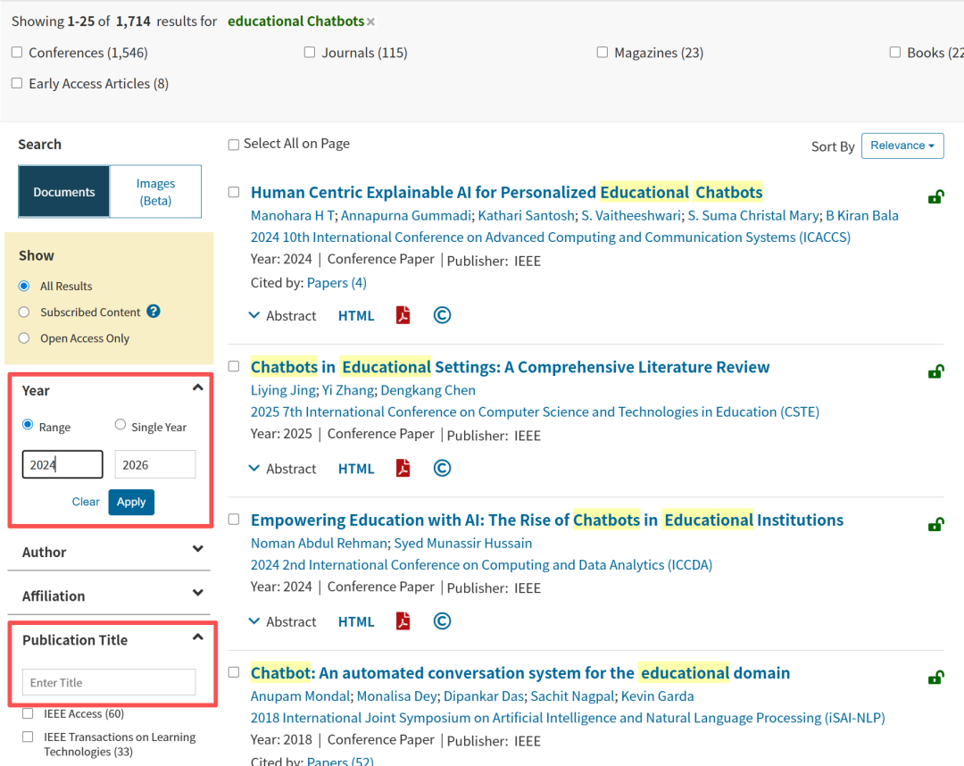 (2)检索文献:请在IEEE Xplore平台(https://ieeexplore.ieee.org)检索框中输入题目的检索关键词,在界面左侧的”Year”中可以限制检索结果的时间范围为(2024-2026),然后在检索结果页面的聚类分析“Publication Title”中输入锦囊中的期刊名。这样,就可以在检索结果中快速找到所需文章。下载相应文章后,根据锦囊提示在全文中寻找答案。如下图示例:
