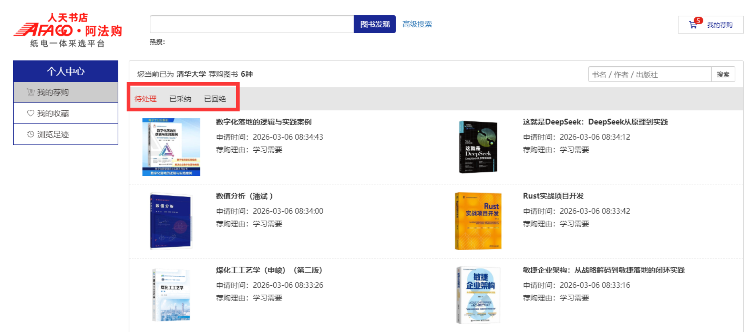 3、我的荐购:【个人中心】→【我的荐购】中可查看到所有的荐购书目,及图书馆的采纳情况。