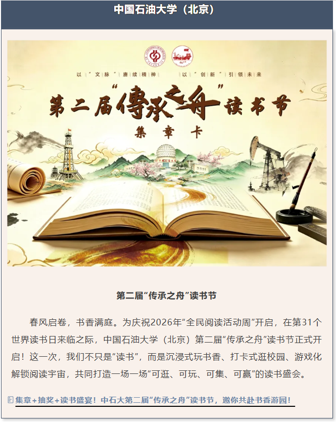 近日,在首个“全民阅读活动周”期间,由北京市委教育工委主办、共青团北京市委员会协办的“书香青春 阅见未来”校园读书季暨2026年首都大学生系列读书活动在北京正式启动,活动现场表彰了荣获北京市校园读书季“青阅领读”先锋、“青阅领读”榜样的20项北京高校读书品牌活动。中国石油大学(北京)“传承之舟”阅读活动荣获北京市校园读书季“青阅领读”榜样。人民日报、新华网、光明网、中国日报网、首都教育、北京日报、新京报、北京晚报、现代教育报、北京市人民政府官网等十余家媒体和官网对读书活动启动以及荣获“青阅领读”称号的高校读书品牌活动进行了报道。