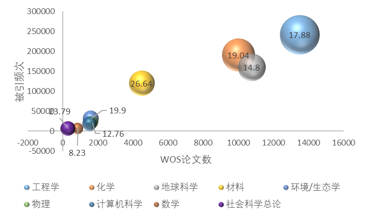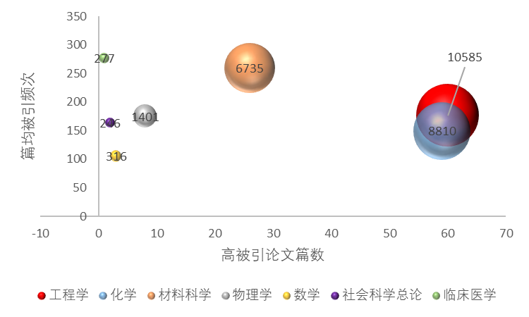 (面积为高被引论文数量,标注为篇均被引)